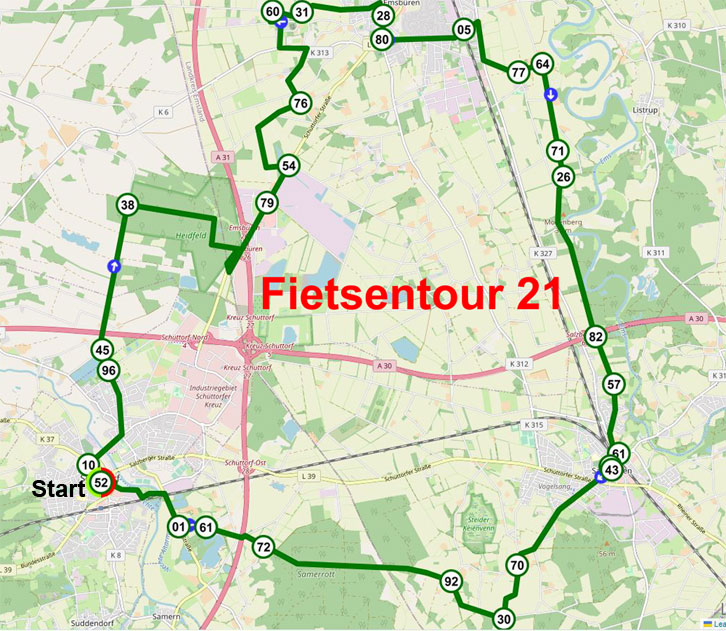 Beschreibung: Tour 21 In der Grafschaft Bentheim gibt es 25 Fietsen-Radtouren die nach dem Knotensystem befahren werde. In den über 1242 km unserer Grafschafter Fietsentour (GFT) steckt alles, was die Grafschaft ausmacht: idyllische Wasserlandschaften an Flüssen und Kanälen, die beeindruckende Bentheimer Sandsteinburg, erstaunliche Kunst am Wegesrand (kunstwegen) und viele malerische Orte. Quelle des Textes: www.grafschaft-bentheim-tourismus.de
