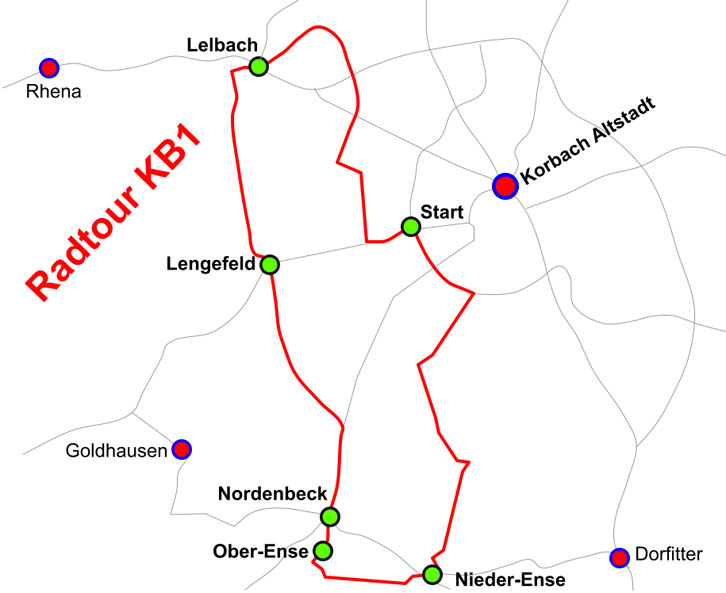Radtour auf verkehrsarmen Strassen und auf Radwegen.